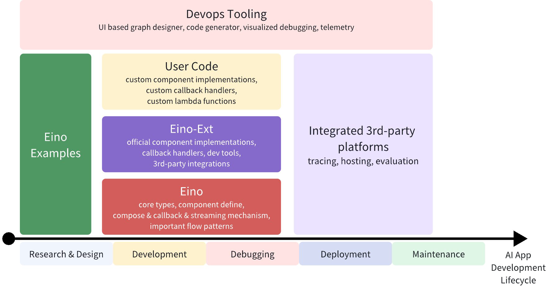 Eino is a LLM application development framework covering the entire devops process, from best practice examples in Eino Examples to toolchains for various stages: