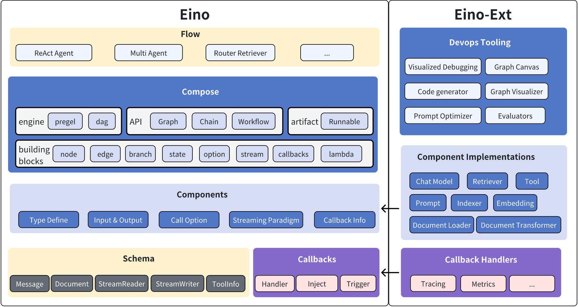 Have you ever felt this way: wanting to add LLM capabilities to your application but not knowing where to start in this relatively new field; wanting to stay at the forefront of research and apply the latest industry achievements, but using an application development framework that hasn’t been updated for months; trying to understand Python code in your project, needing to repeatedly check context to confirm a variable or parameter type; unsure whether the model-generated results are good enough and hesitant to use them; needing to explore and learn additional tools for necessary aspects beyond development like debugging, tracing, and evaluation. If so, welcome to Eino! As a LLM application development framework aimed at covering the entire devops process, Eino has the following characteristics:
