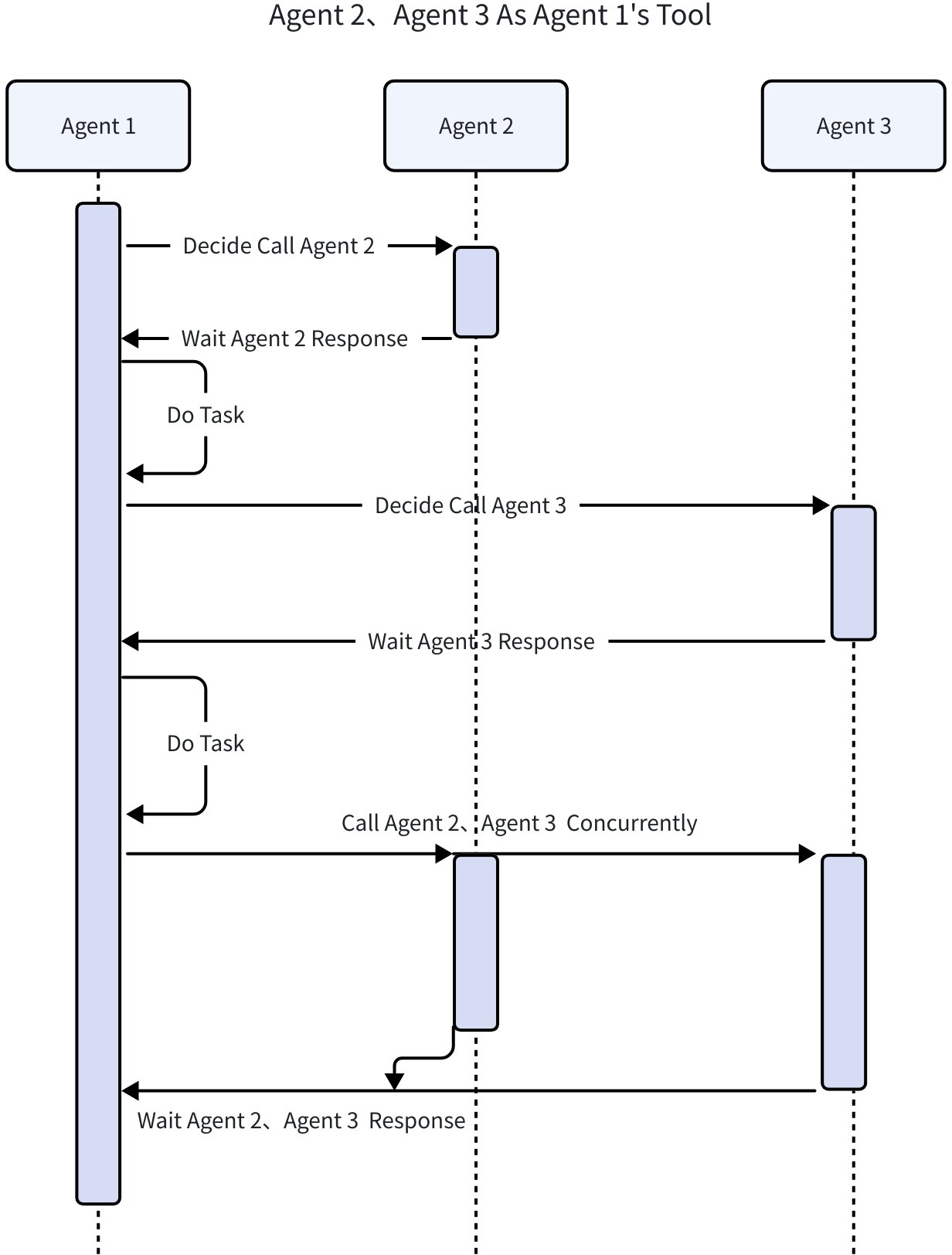 | ToolCall(AgentAsTool) | 将 Agent 当成 ToolCall 调用,等待 Agent 的响应,并可获取被调用Agent 的输出结果,进行下一轮处理 |