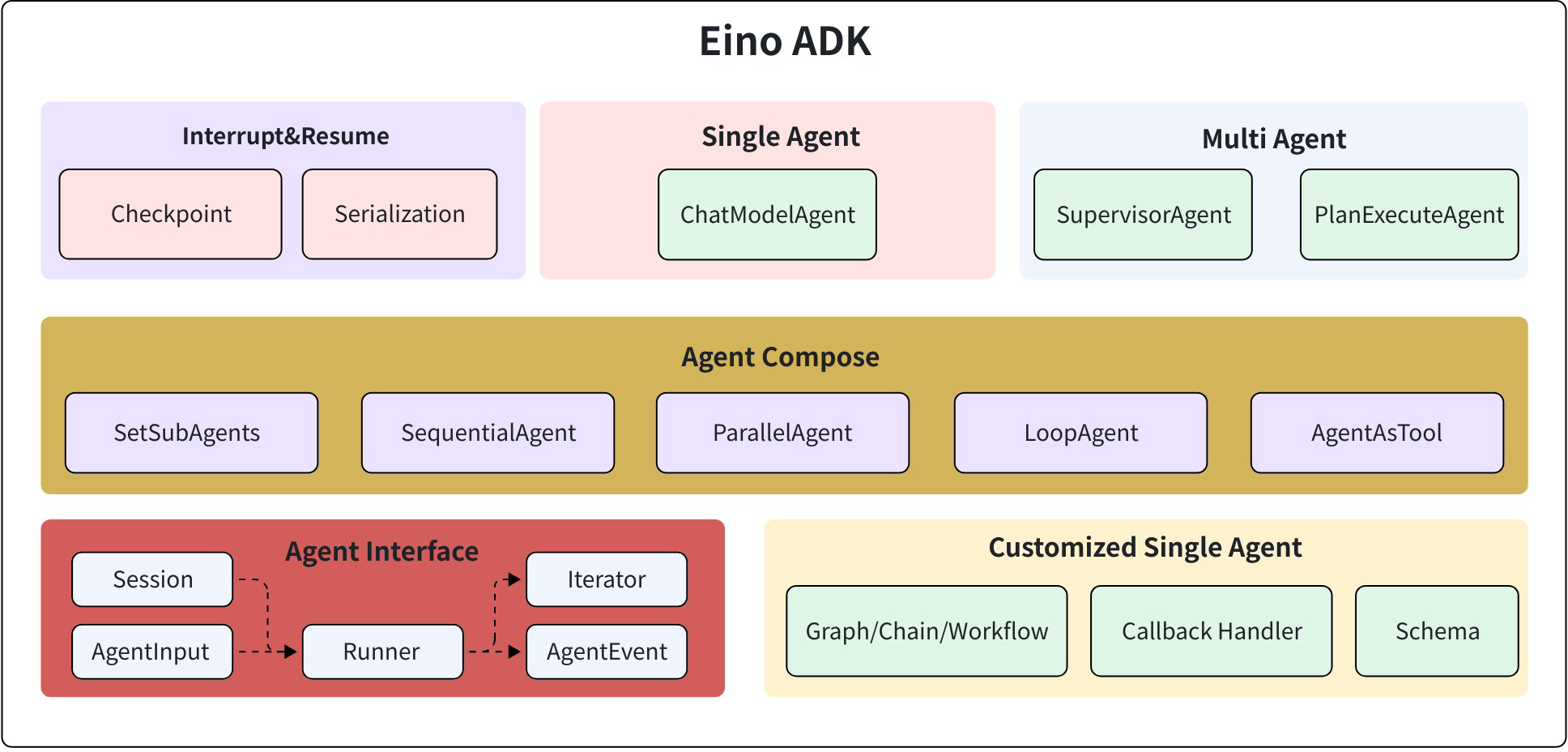 Eino ADK 的核心是 Agent 抽象(Agent Interface),ADK 的所有功能设计均围绕 Agent 抽象展开。详解请见 Eino ADK: Agent 抽象 [New]