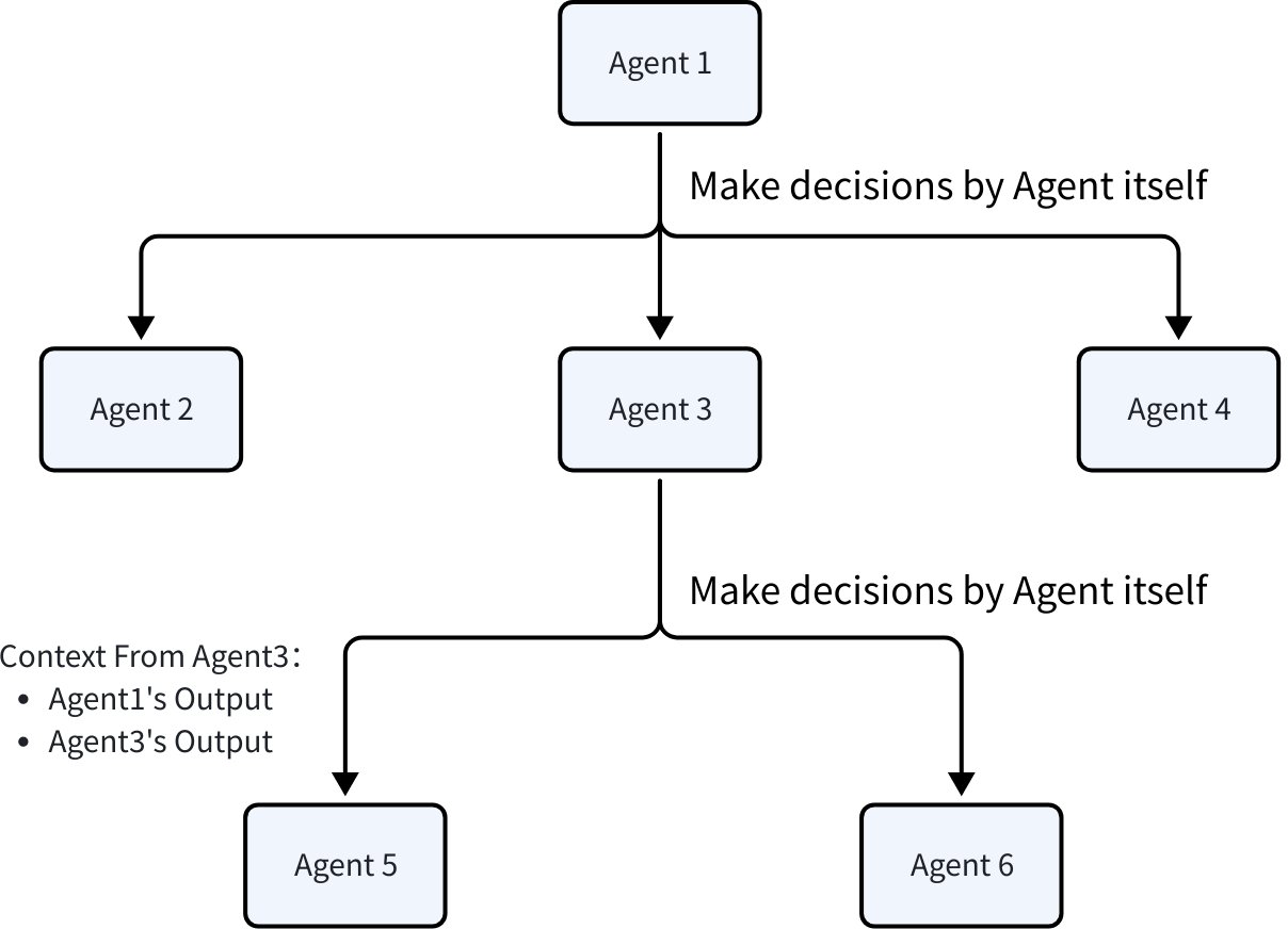 | 自主决策 | 在 Agent 内部,基于其可选的下游 Agent, 如需协助时,自主选择下游 Agent 进行协助。 一般来说,Agent 内部是基于 LLM 进行决策,不过即使是基于预设逻辑进行选择,从 Agent 外部看依然视为自主决策 |