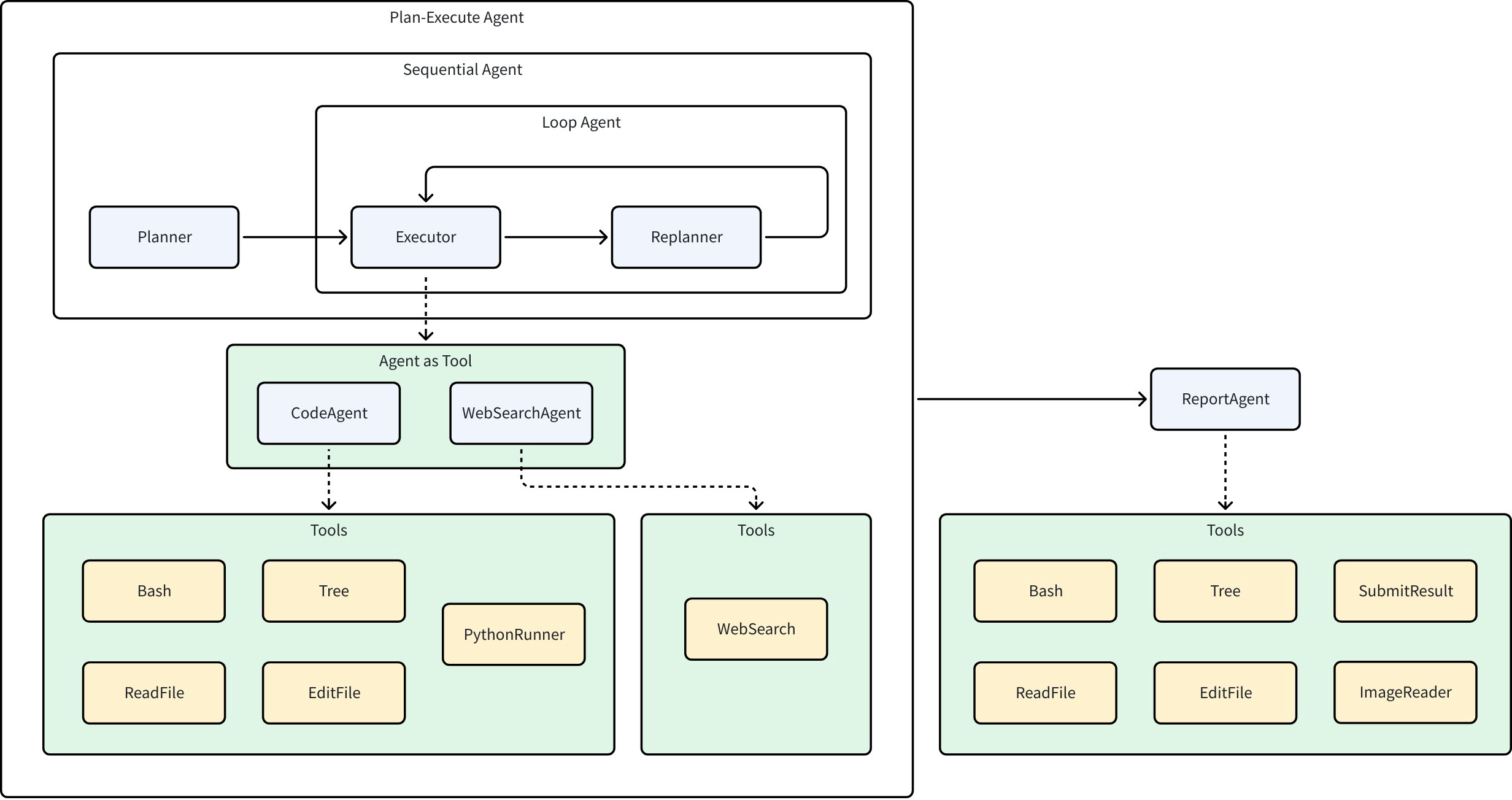 - CodeAgent:接收来自 Executor 的指令,调用多种工具(例如读写文件,运行 python 代码等)完成任务