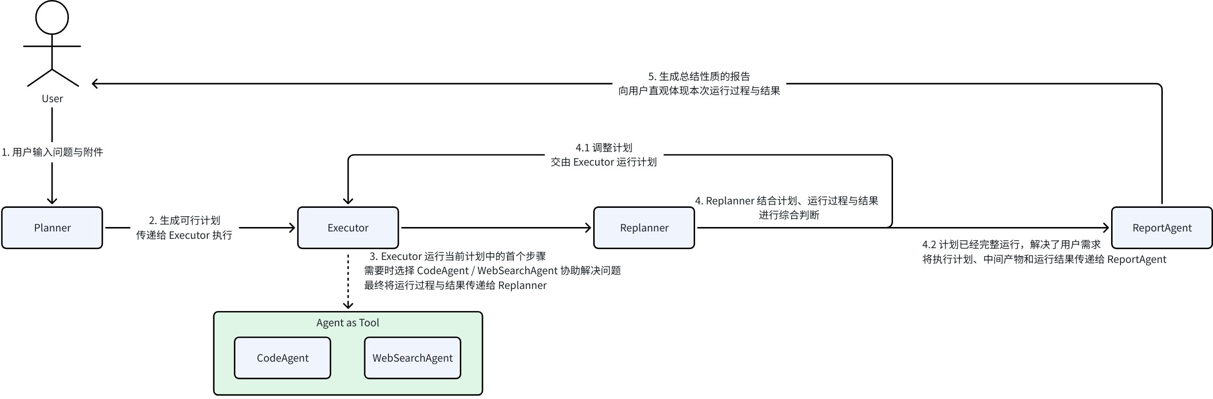 - 顺序运行:Plan-Executor 整体运行完后,固定运行一次 ReportAgent 进行总结。