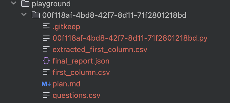 final_report.json{ "is_success": true, "result": "Successfully extracted the first column from questions.csv and saved it to first_column.csv.", "files": [ { "path": "/User/user/go/src/github.com/cloudwego/eino-examples/adk/multiagent/integration-excel-agent/playground/00f118af-4bd8-42f7-8d11-71f2801218bd/first_column.csv", "desc": "A CSV file containing only the first column data from the original questions.csv." } ] }