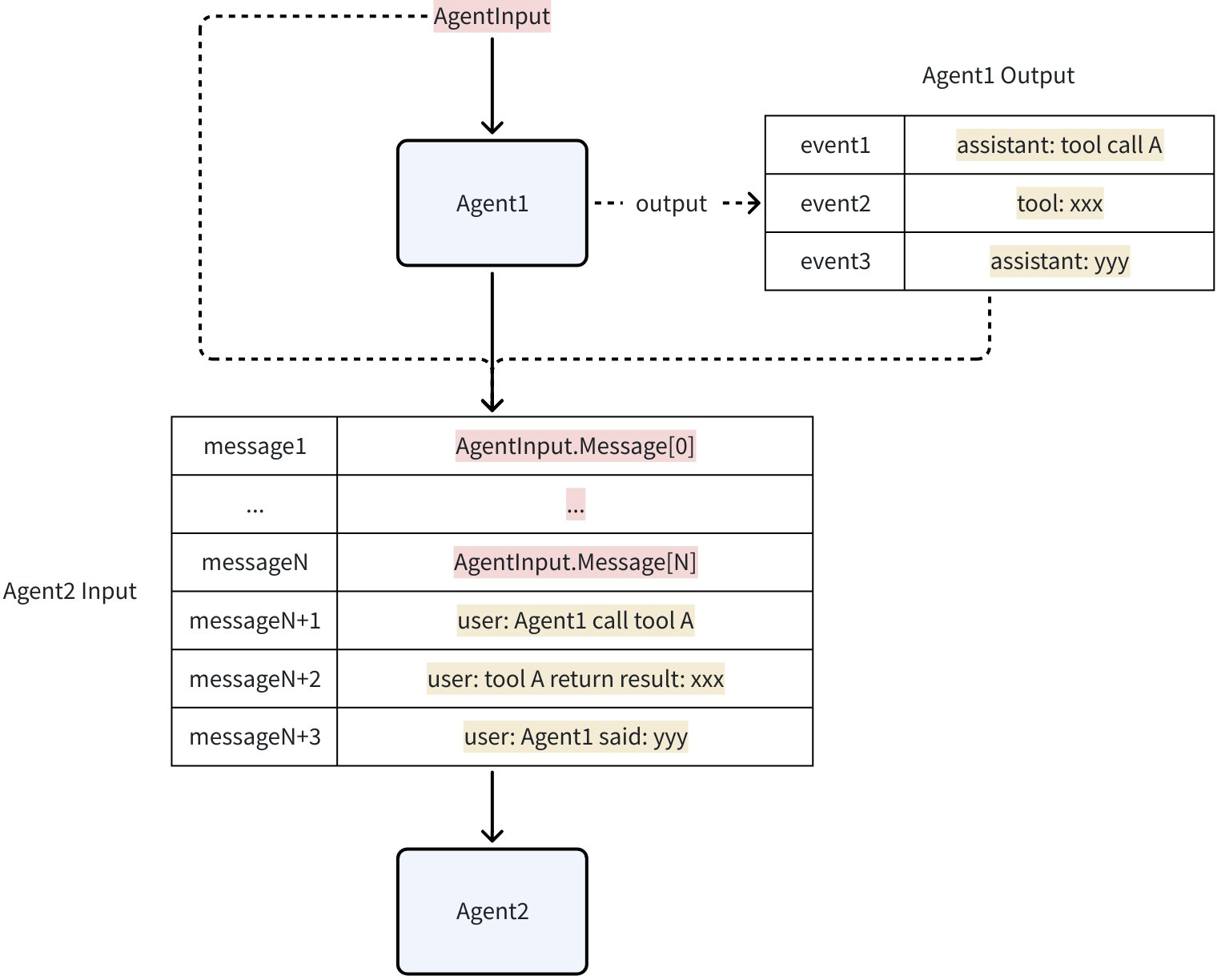 - History:每一个 Agent 产生的 AgentEvent 都会被保存到这个隐藏的 History 中,调用一个新 Agent 时 History 中的 AgentEvent 会被转换并拼接到 AgentInput 中。默认情况下,其他 Agent 的 Assistant 或 Tool Message,被转换为 User Message,这相当于在告诉当前的 LLM:“刚才, Agent_A 调用了 some_tool ,返回了 some_result 。现在,轮到你来决策了。”。 通过这种方式,其他 Agent 的行为被当作了提供给当前 Agent 的“外部信息”或“事实陈述”,而不是它自己的行为,从而避免了 LLM 的上下文混乱。