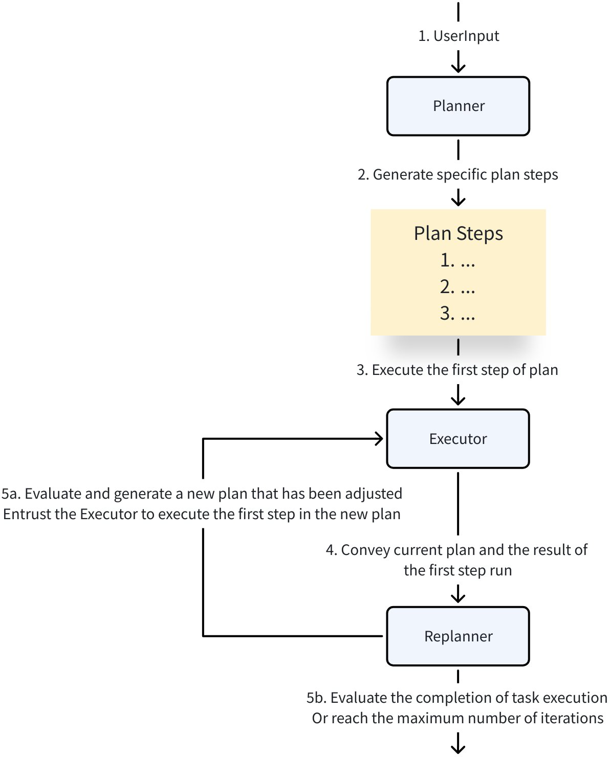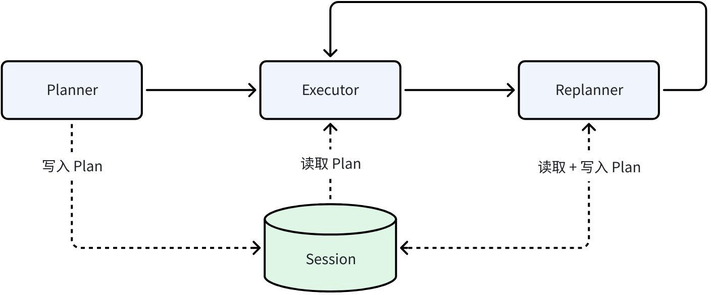 - 循环运行:Executor 和 Replanner 需要按需循环运行多次,每次循环运行都是先运行 Executor 后运行 Replanner